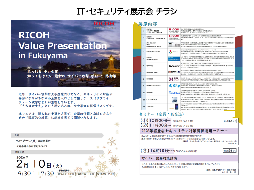 リコージャパン福山事業所では、2026年2月10日(火)に企業向けIT・セキュリティ展示会を開催いたします。