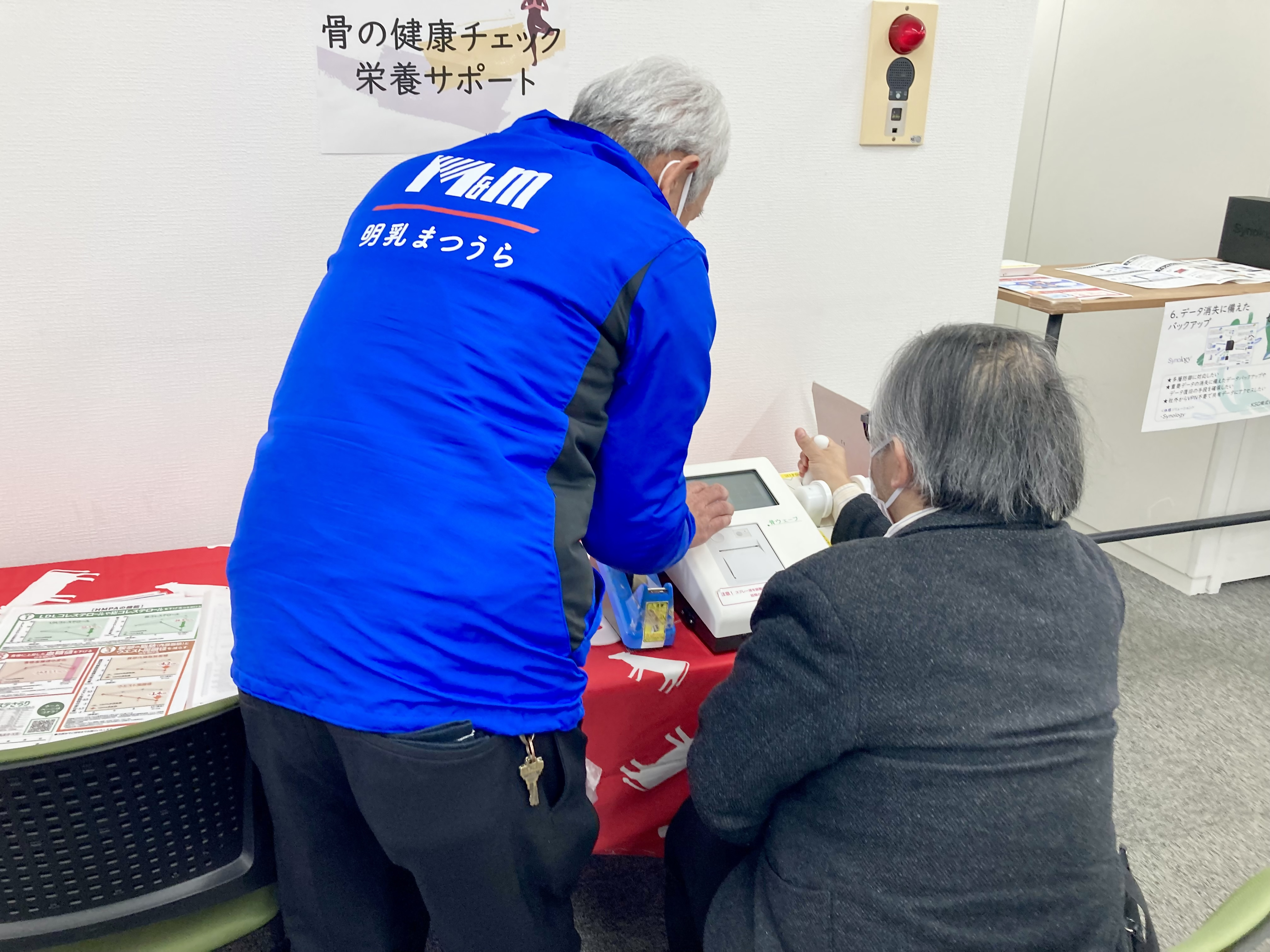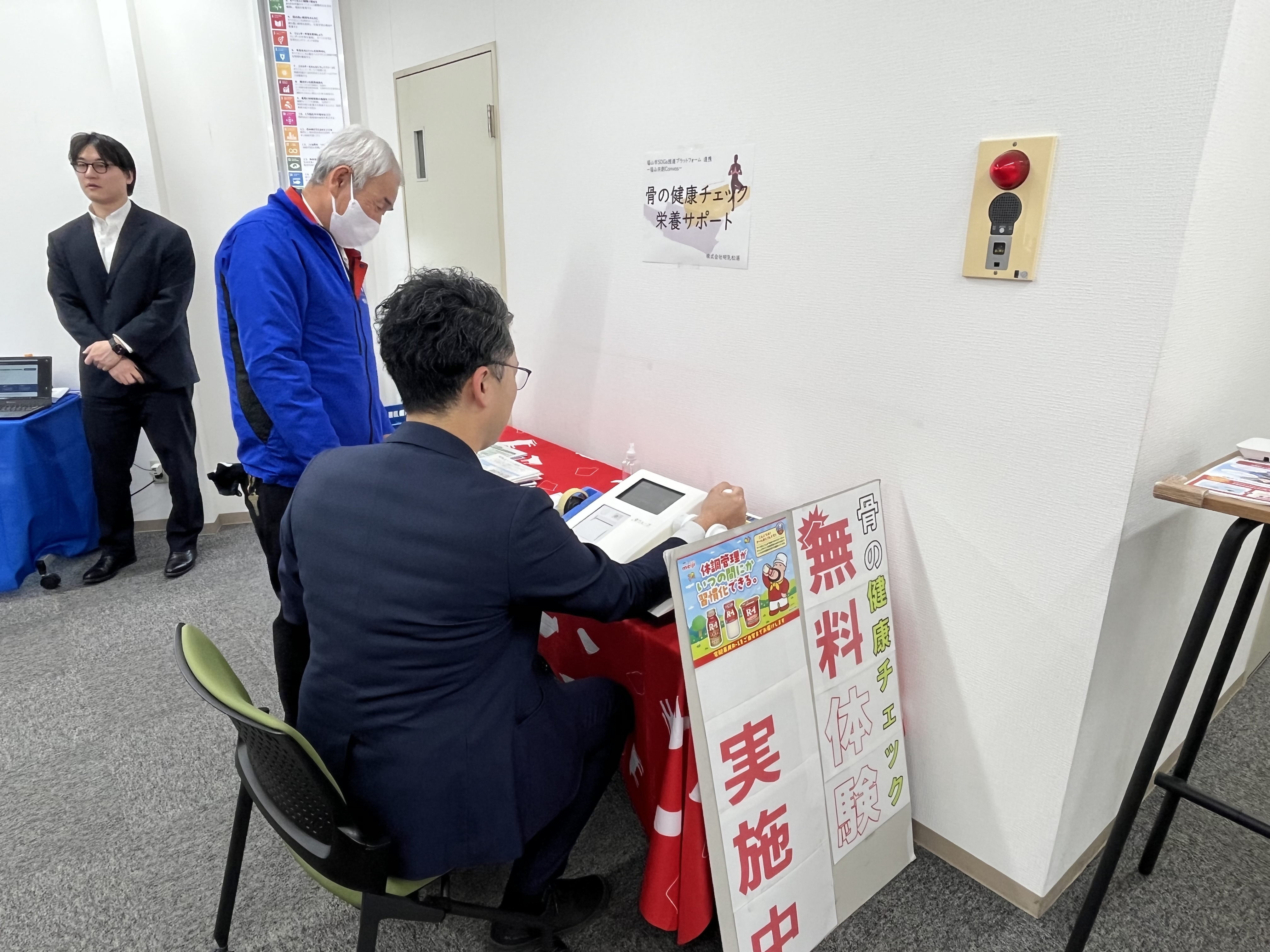 当日は、この「福山共創Canvas」に、明乳松浦が「骨の健康チェック」の体験ブースを出展。ビジネス展示会ということもあって、明乳松浦が健康イベントで接している方々とは異なり、企業で働く方々に多く来場していただきました。普段健康を意識する機会が少ないと思われる方々に対して、自身の健康状態について考えていただく貴重な機会となりました。